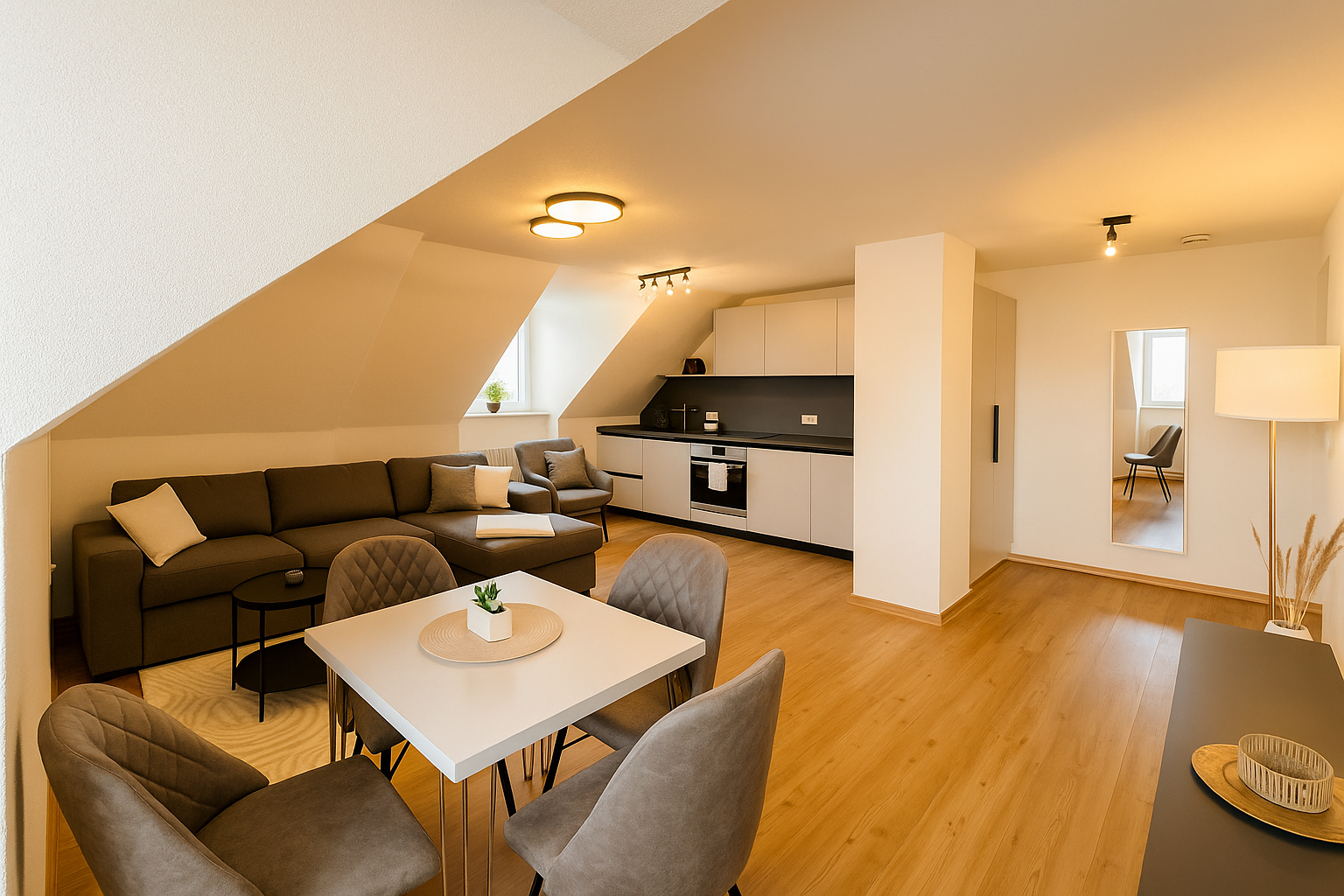 Stilvolle Dachgeschosswohnung mit offener Küche, großem Essbereich und viel Licht. Besonders beliebt bei Paaren und kleinen Familien.